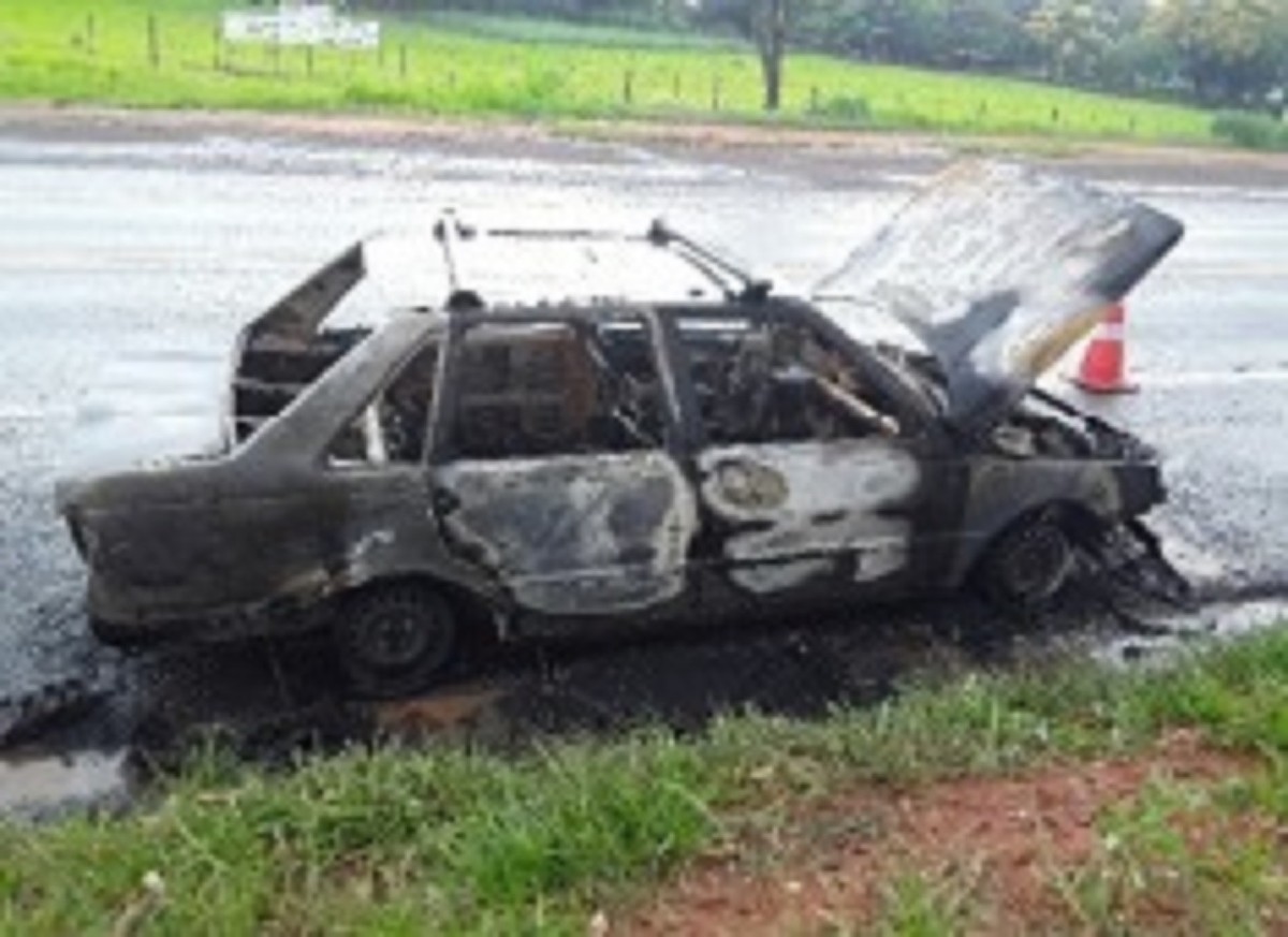 Com suspeita de pane elétrica, carro pega fogo e fica totalmente destruído na Rodovia Assis Chateaubriand, em Parapuã