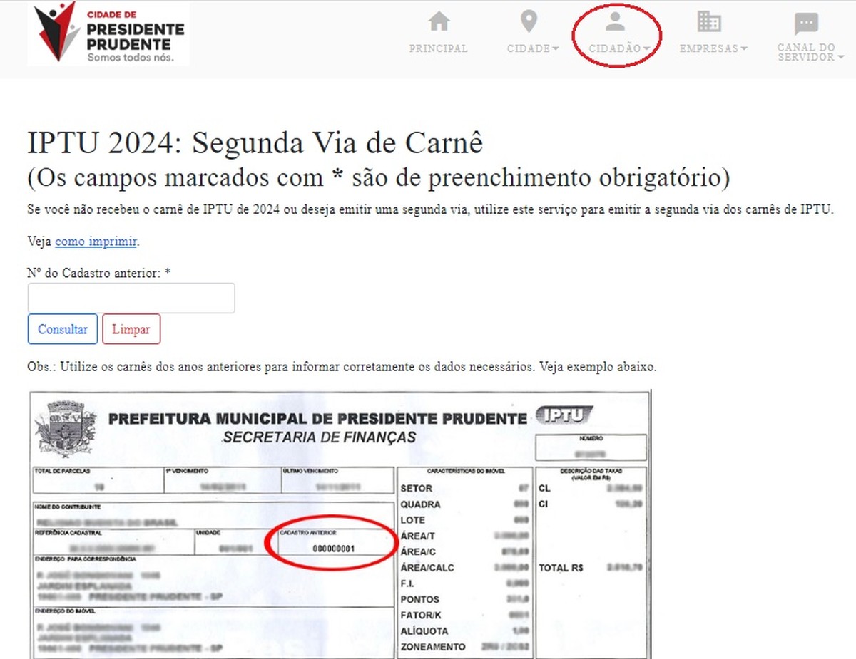 Para imprimir o carnê, é necessário acessar o site da Prefeitura de Presidente Prudente. O acesso exige o número do cadastro, que está disponível em carnês de anos anteriores.