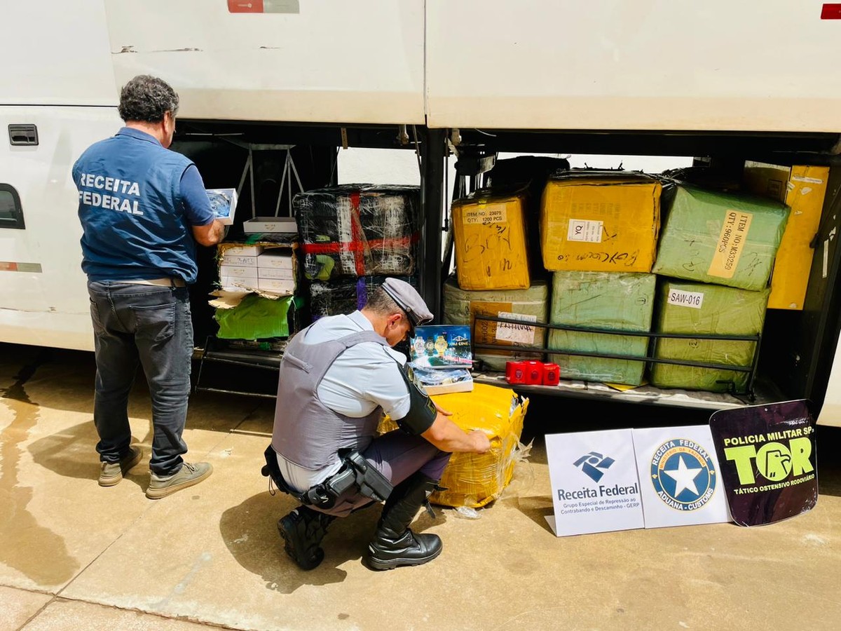 O ônibus e os produtos ficaram apreendidos na Delegacia da Receita Federal, em Presidente Prudente (SP).