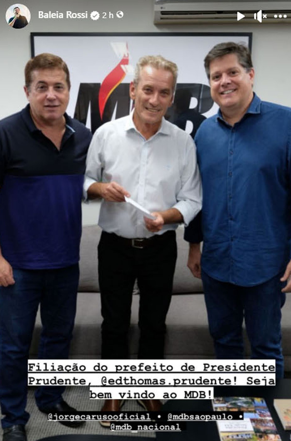 “Filiação do prefeito de Presidente Prudente, @edthomas.prudente! Seja bem-vindo ao MDB!”.