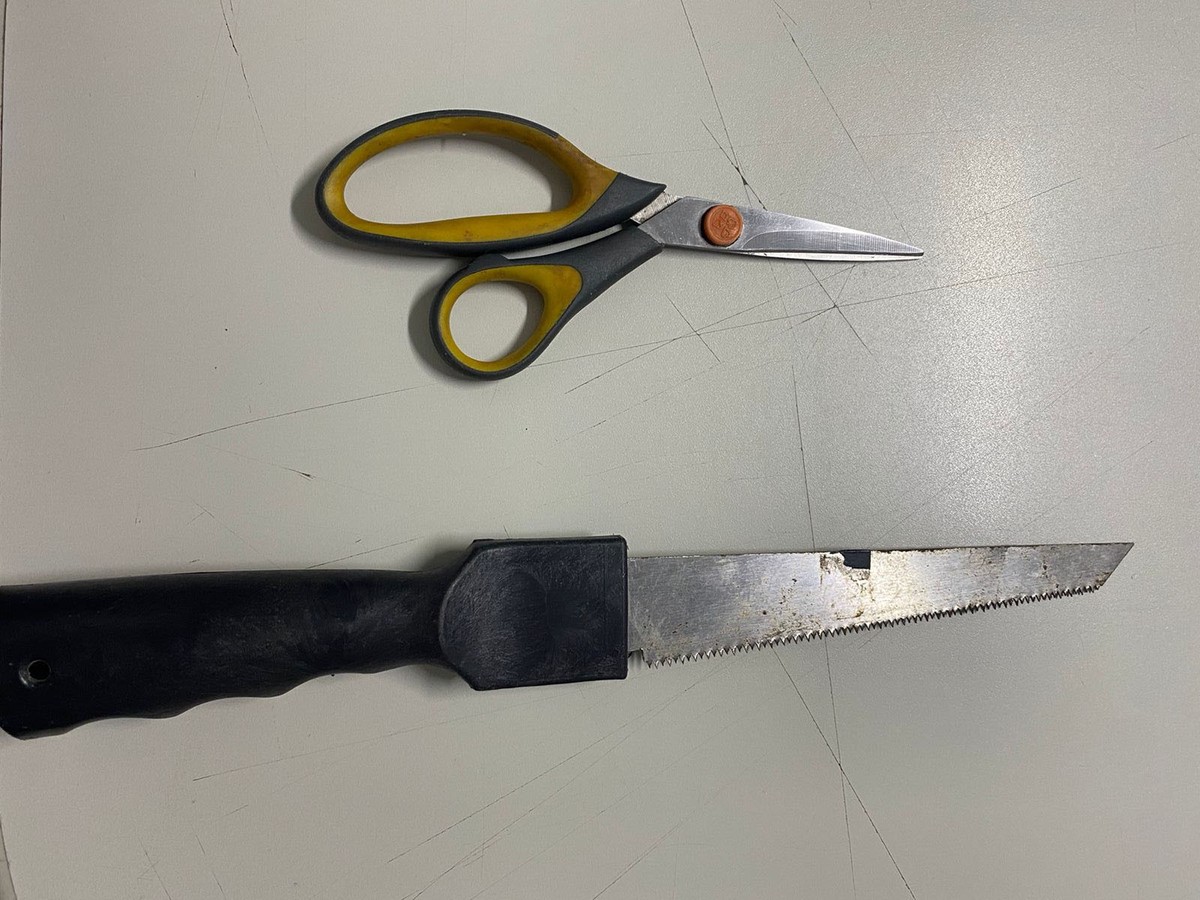 Os policiais militares que compareceram ao local para o atendimento da ocorrência apreenderam uma faca e uma tesoura ao lado do sofá na sala onde estava o suspeito.