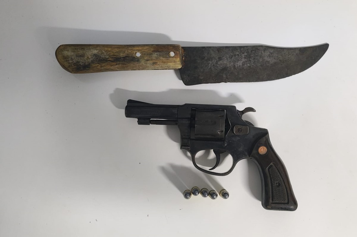 Ao ser questionado sobre a arma, o jovem informou que estava ao lado da churrasqueira, localizada nos fundos. No local, os policiais encontraram um revólver calibre 21 carregado com cinco cartuchos intactos. Uma faca de cozinha, também utilizada durante o assalto, foi apreendida dentro da casa.