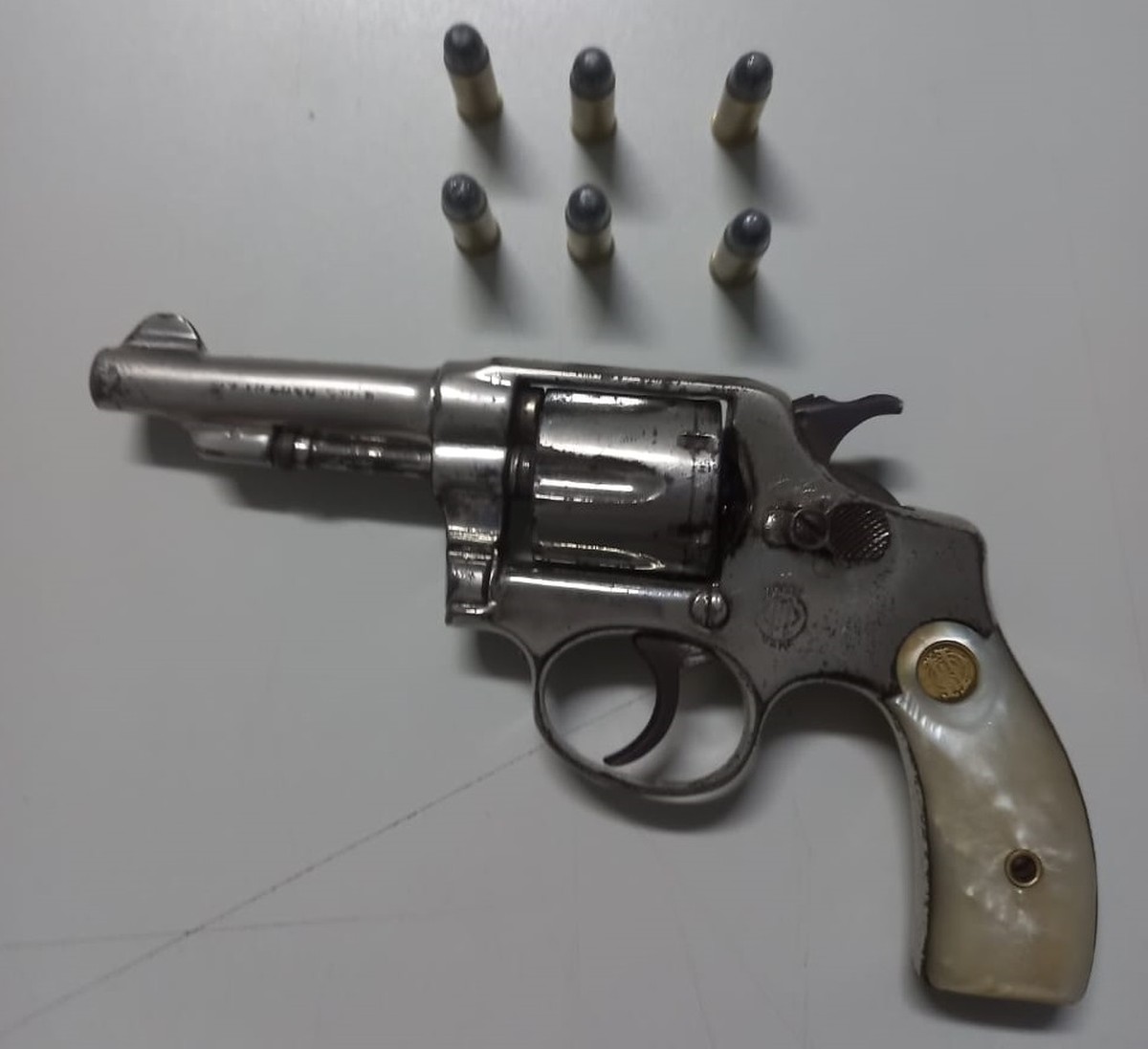 O revólver calibre 32 foi localizado e apreendido sob algumas peças de madeira, na via pública, com seis cartuchos íntegros em condição de uso, e sem o registro.