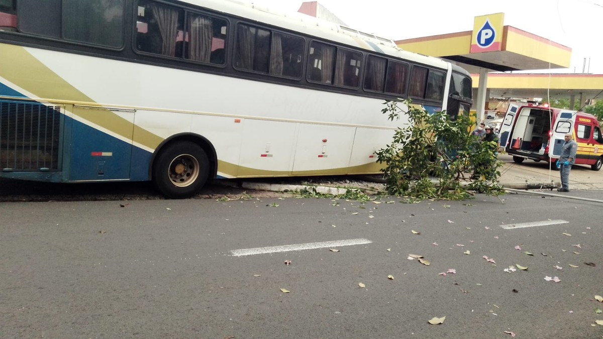 De acordo com informações da Polícia Militar, o ônibus, que estava no pátio de um posto de combustíveis, perdeu o freio e desceu, atingindo um poste de energia elétrica e árvores do local.
