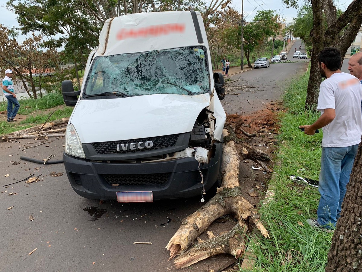 Um furgão de uma transportadora rodoviária foi atingido por fragmentos de uma árvore do canteiro central na Avenida Paulo Marcondes na tarde desta sexta-feira (14), no Jardim Barcelona, em Presidente Prudente (SP). A frente do veículo foi danificada.