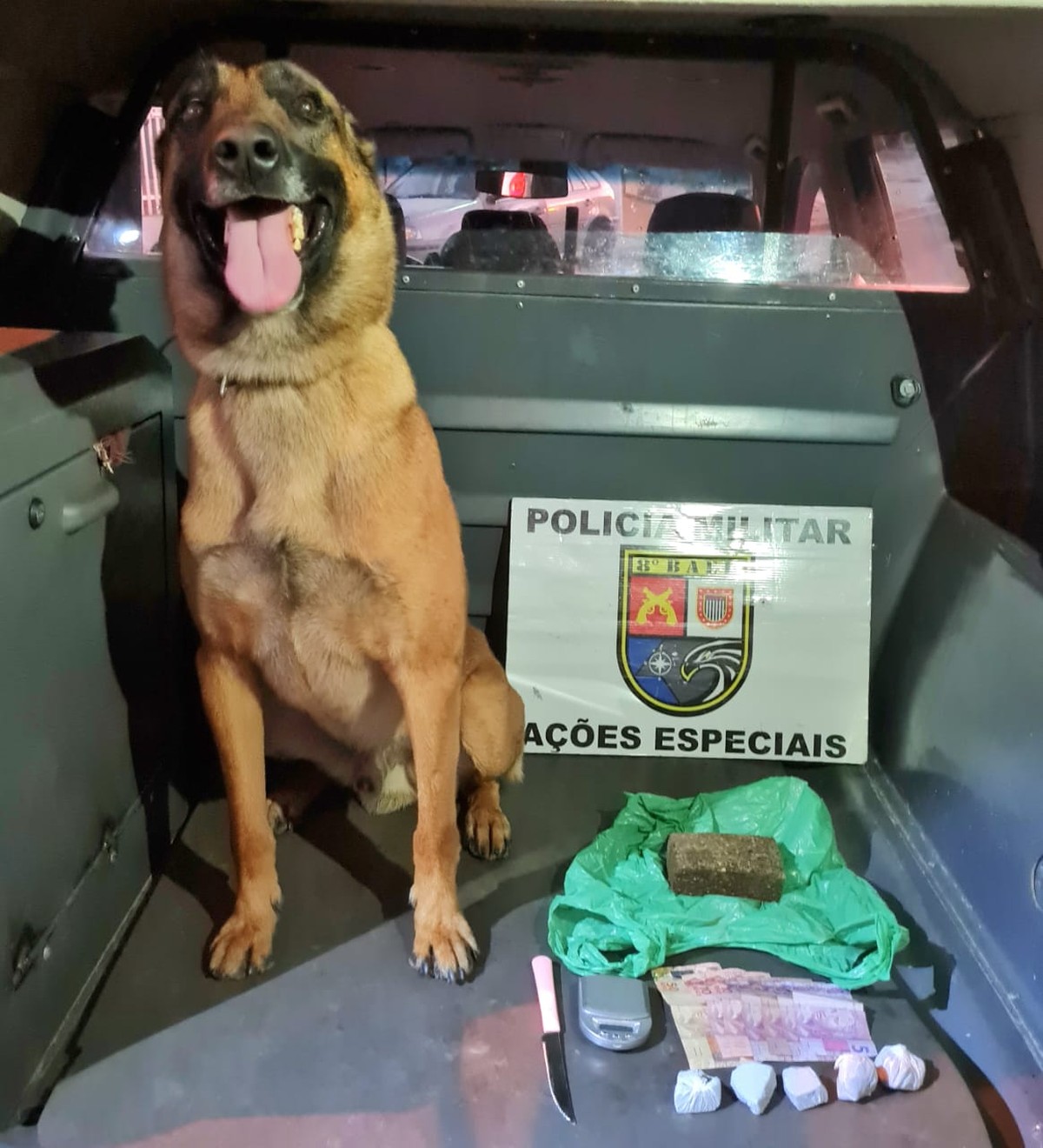 Ocorrência contou com auxílio do cão de faro Iron, que encontrou um tijolo de maconha, uma faca e balança de precisão. Homem é preso por tráfico de drogas no Jardim Humberto Salvador; cão de faro Iron auxiliou na ocorrência