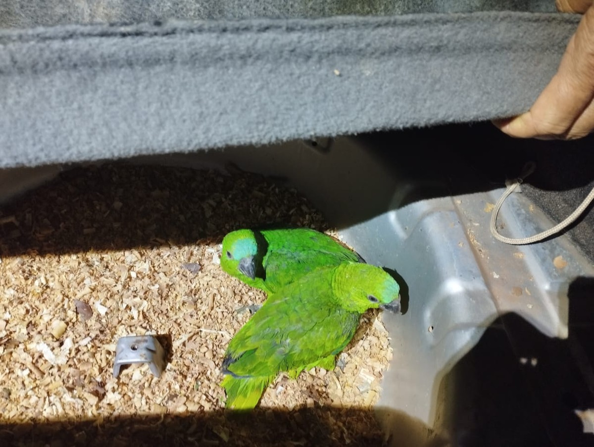 De acordo com informações da Polícia Ambiental, os policiais abordaram, durante patrulhamento, o carro do idoso e, em busca veicular, localizaram dois filhotes de papagaio da espécie Amazona aestiva sendo transportados dentro do compartimento de estepe do automóvel.
