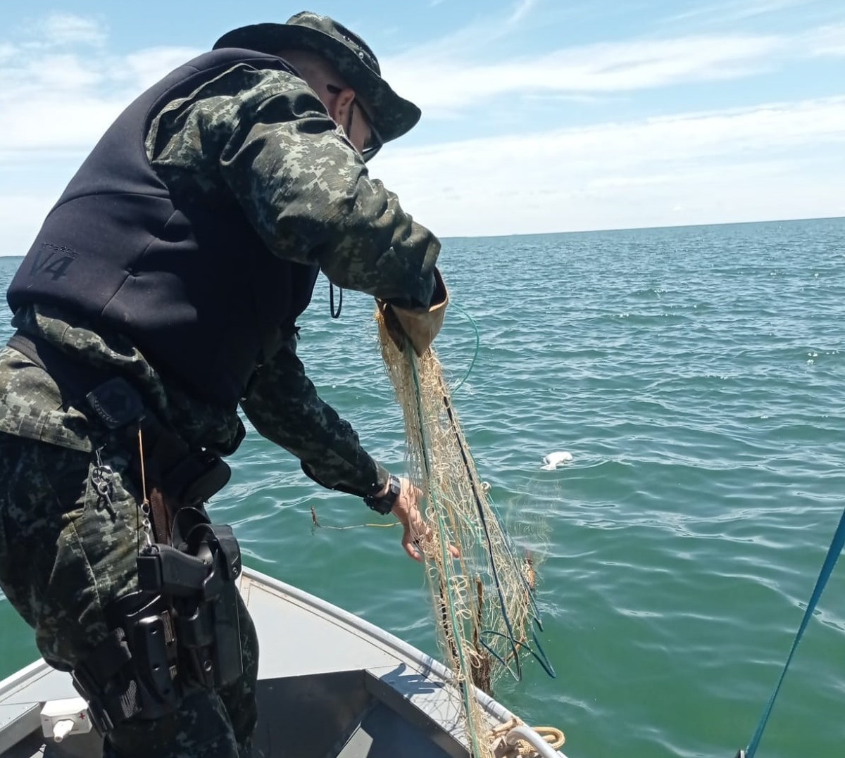 Polícia Ambiental apreende 200 metros de redes armadas irregularmente no Rio Paraná, em Rosana (SP)