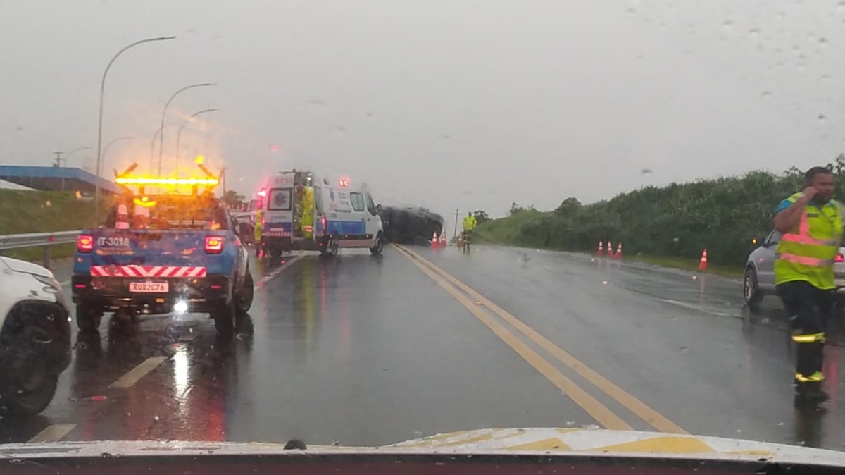 O veículo que teve a aquaplanagem acabou tombando sobre a via após a colisão.