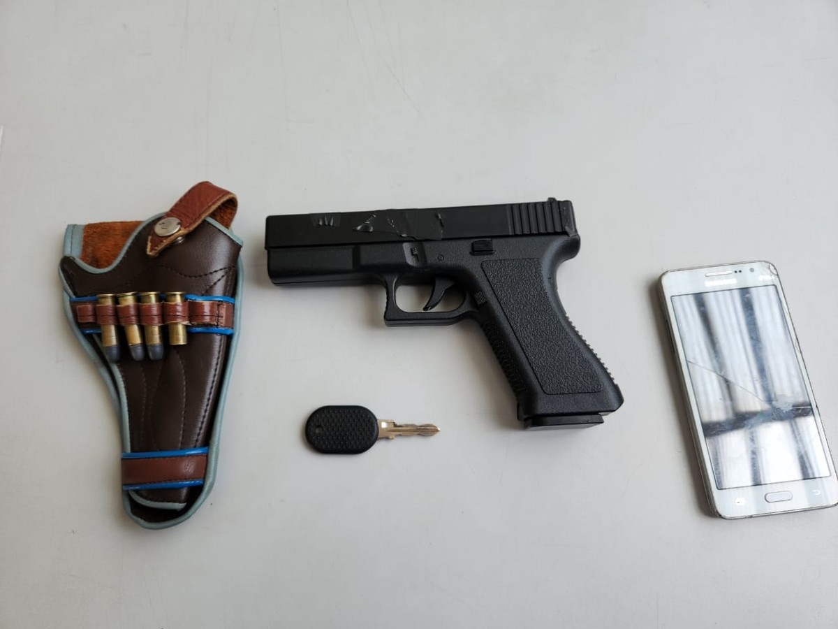 Na delegacia, os moradores identificaram que o simulacro apreendido no carro foi o mesmo utilizado no roubo. Eles também reconheceram o homem preso como um dos autores do roubo.