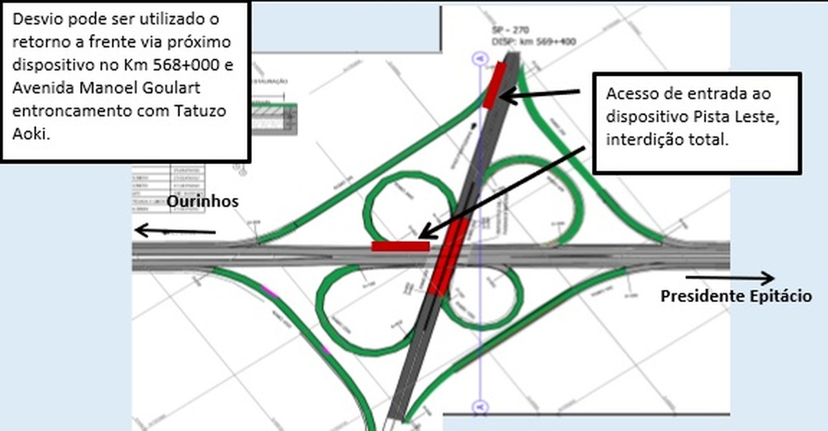 Já no sábado (4), as equipes concentrarão os trabalhos no dispositivo existente no km 569,400 que estará totalmente interditado nas alças de entrada e saída da rodovia. Os motoristas que pretendem acessar a cidade de Presidente Prudente poderão prosseguir no retorno localizado no km 568. Já os condutores que estiverem na Avenida Manoel Goulart e pretendem ingressar na SP-270 sentido interior, devem utilizar o retorno que fica no cruzamento da avenida com a Rua Tatuzo Aoki.