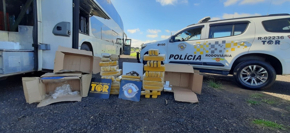 O veículo foi abordado pela fiscalização no km 655 da Rodovia Comandante João Ribeiro de Barros (SP-294) e as mercadorias ilícitas estavam em três caixas no bagageiro externo do ônibus.