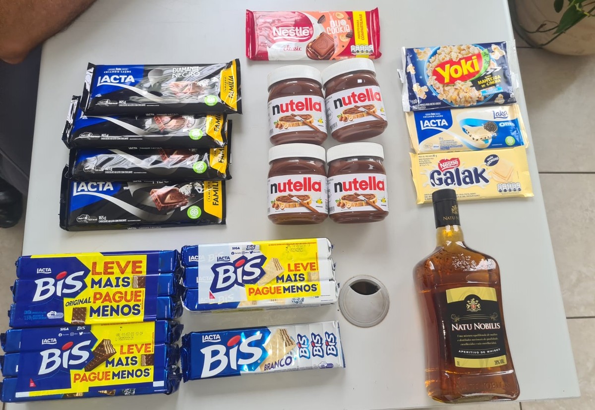 Dentro da mochila foram localizados dez pacotes de wafer com cobertura de chocolate, sete barras de chocolate, quatro potes de creme de avelã, uma pipoca e uma bebida alcoólica.