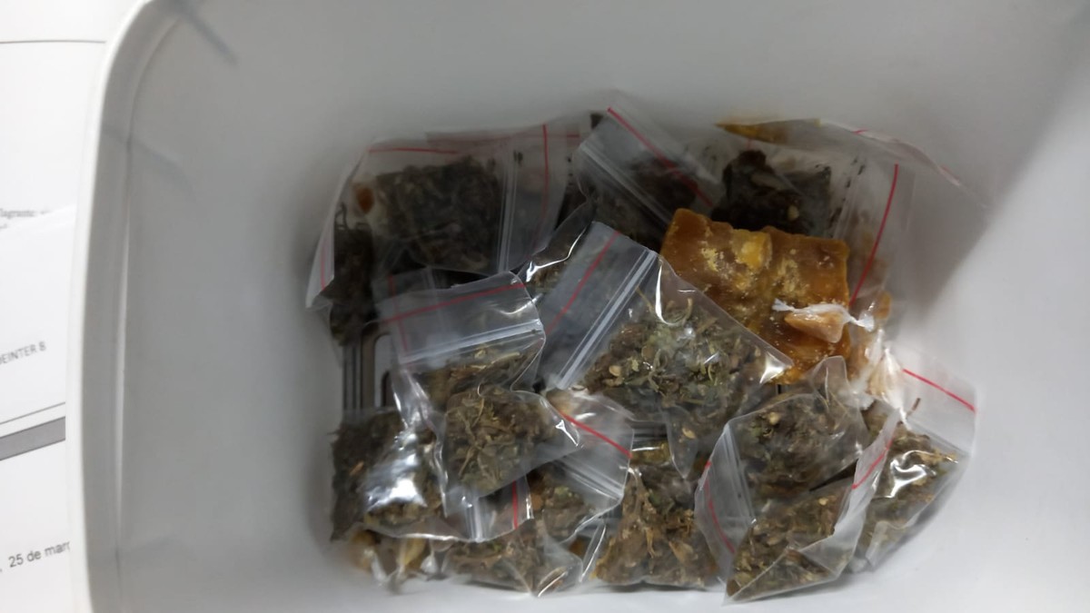 Em vistoria acompanhada pela mãe do jovem, dentro de um pote de sorvete, foram encontradas porções de crack e maconha, embaladas e prontas para a venda, bem como a balança.