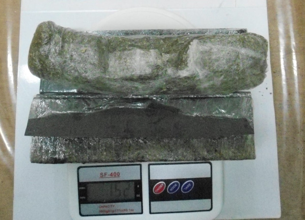 Ao ser questionada, a mulher admitiu estar trazendo ilícitos e, em local apropriado, retirou e entregou voluntariamente dois invólucros com porções de substância branca, aparentando ser o entorpecente cocaína e dois invólucros com porções de erva esverdeada, aparentando ser o entorpecente Maconha, que estavam escondidos no cós da calça.
