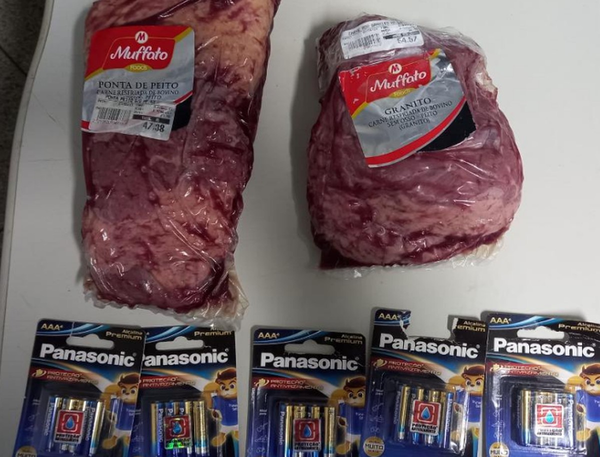 Interrogado, o suspeito, de 29 anos, disse pretendia trocar os objetos, que somam R$ 219,40, por drogas. Homem, de 29 anos, é preso após furtar duas peças de carne e cinco pacotes de pilhas de hipermercado em Presidente Prudente (SP)