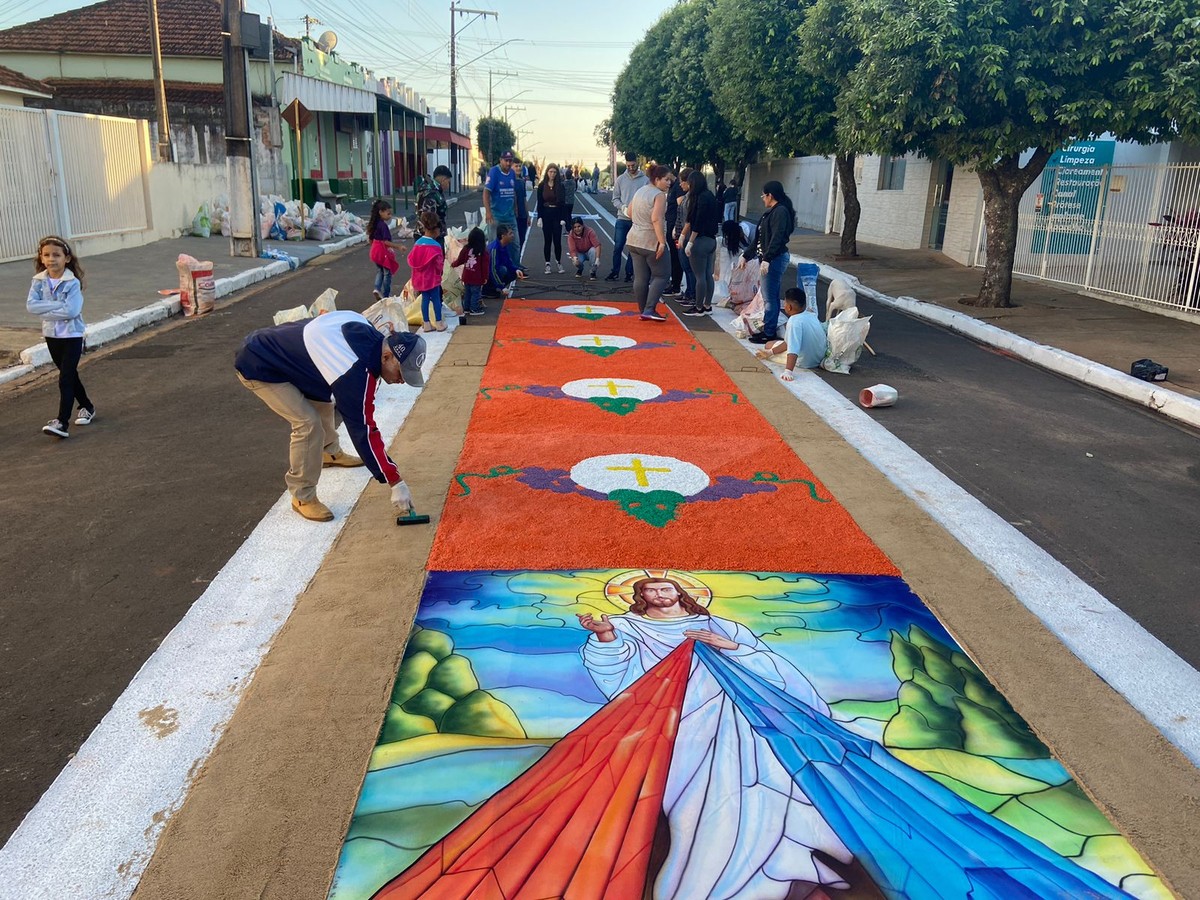 Missa será realizada às 18h na Igreja Matriz, após a procissão. Cerca de 32 toneladas de granilha foram utilizadas na confecção dos enfeites nas ruas. Cerca de 800 fiéis se reuniram para montar os tradicionais tapetes, em Piquerobi (SP)