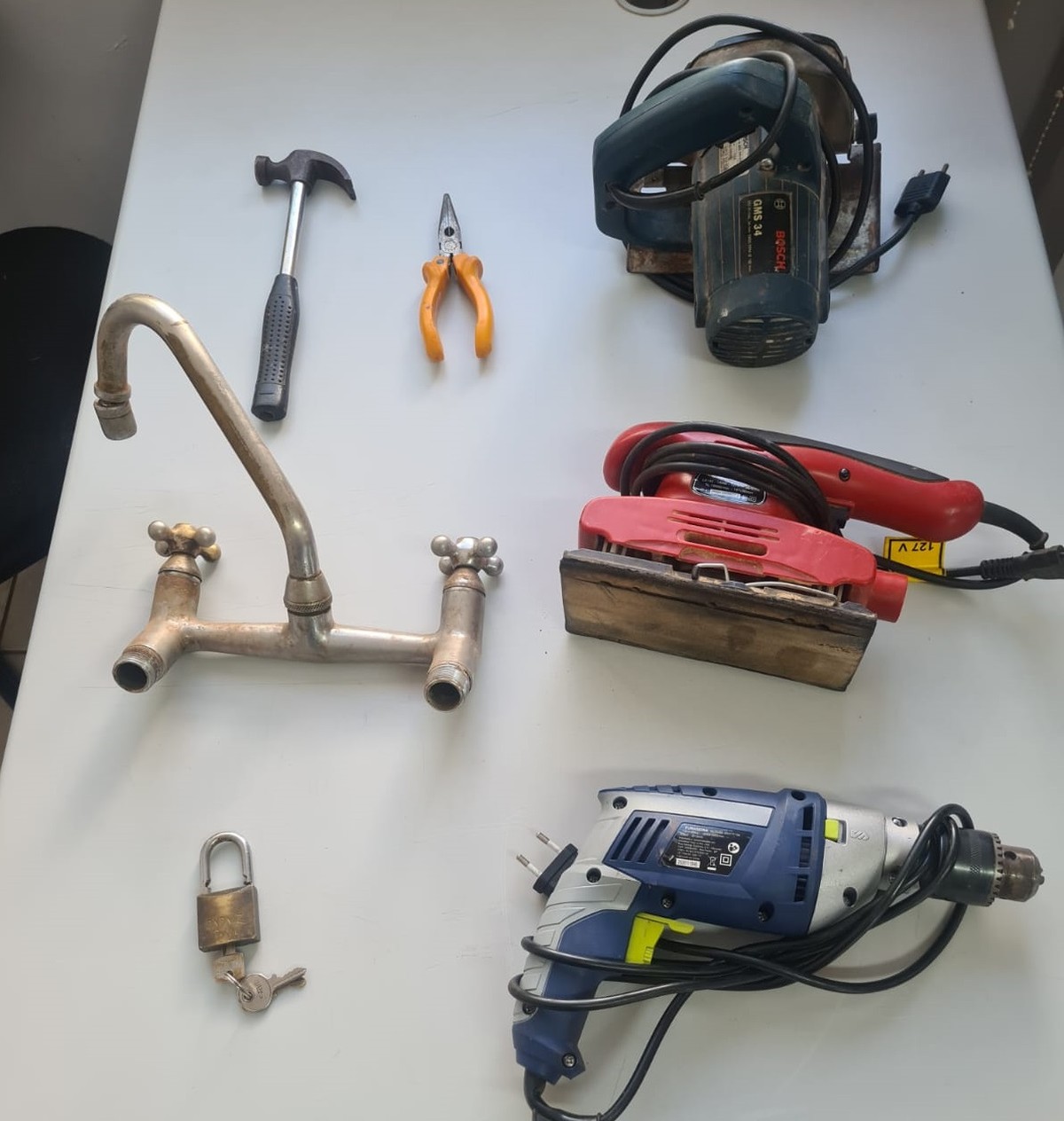 Com o apoio de outra equipe, foi localizada uma furadeira elétrica, uma lixadeira, uma serra circular, um martelo, um alicate de corte e uma torneira, todos os objetos reconhecidos pela vítima como sendo de sua propriedade.