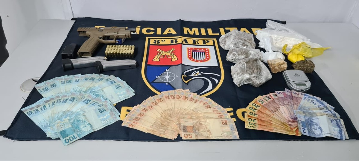 No local, o jovem indicou onde estavam os entorpecentes, sendo que a esposa dele acompanhou as buscas. De acordo com a Polícia Civil, as drogas estavam em um guarda-roupas, junto com uma pistola calibre .9, com carregador municiado, e dinheiro. O investigado teria, ainda, indicado um fundo falso embaixo do fogão, onde foram localizados mais carregadores municiados, totalizando 50 projéteis.