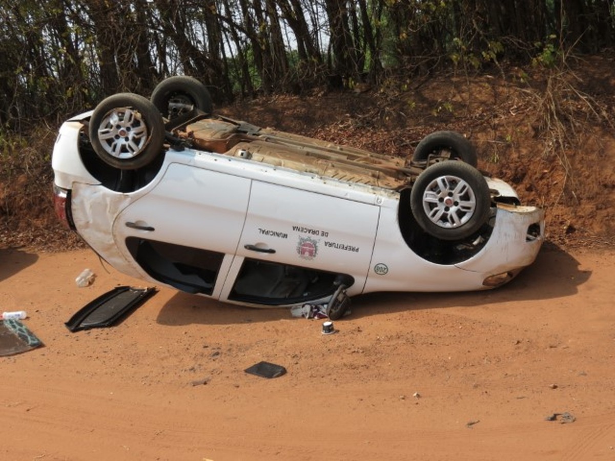 Carro oficial da Prefeitura de Dracena (SP) capota em estrada de terra que dá acesso ao Conjunto Habitacional Florindo Tabachi