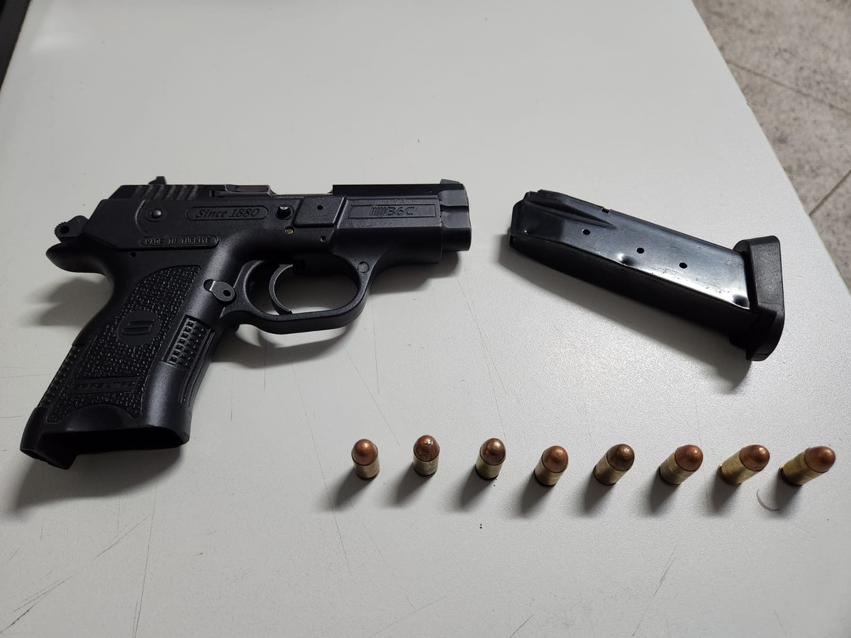 O suspeito não soube informar o calibre da arma, mas disse que estava com a numeração suprimida e carregada com oito cartuchos de calibre 380.