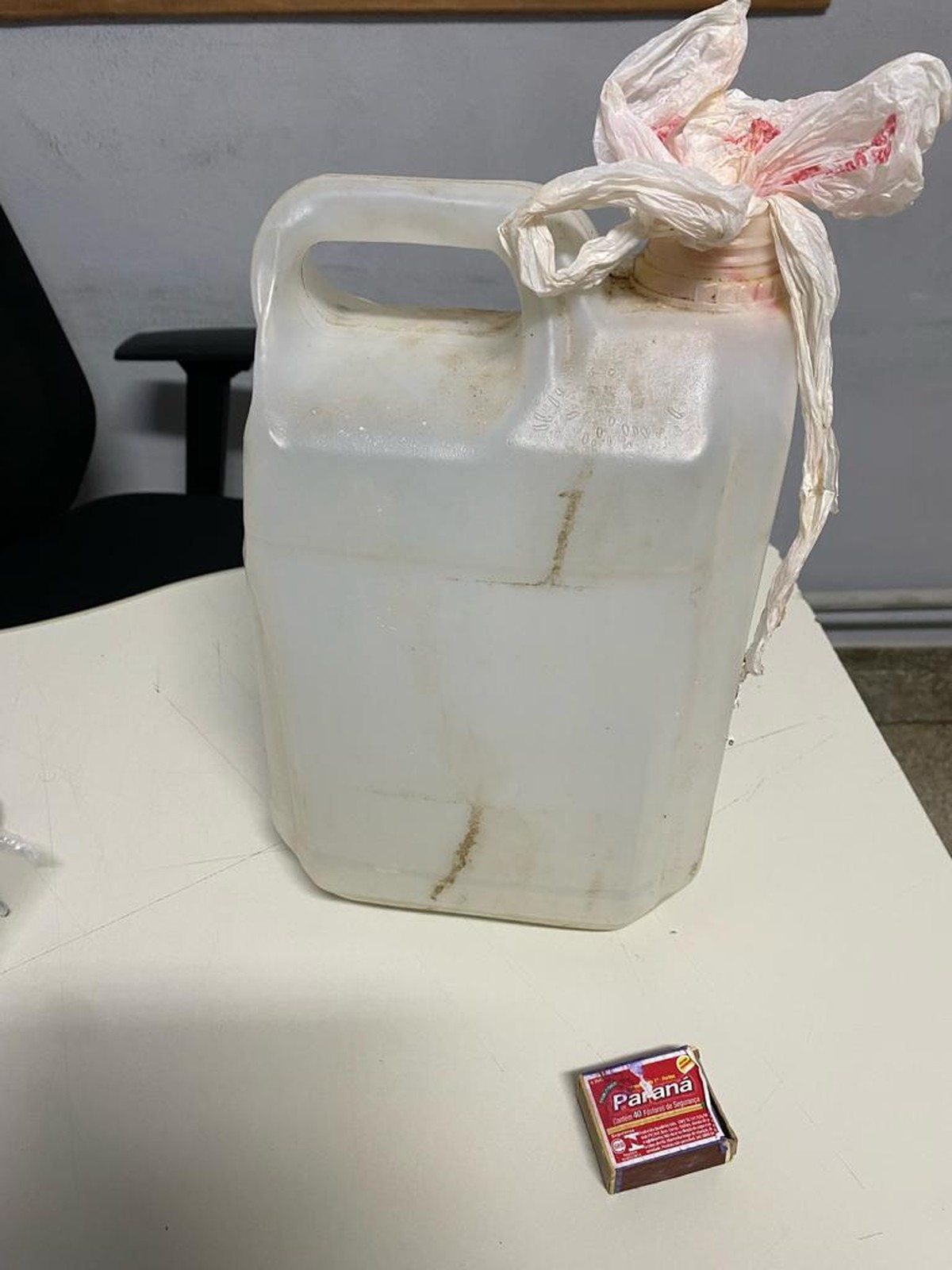 Ao perceber que havia sido notado, ele pulou o muro e colocou um plástico na entrada de um galão, como se tentasse fazer um Coquetel Molotov. Enquanto ainda tentava atear fogo no local, ele foi interrompido por outra viatura da polícia.