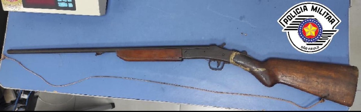 Polícia Militar encontrou espingarda ao lado do guarda-roupas no quarto do casal. Idoso é preso por posse ilegal de arma de fogo e violência doméstica, em Panorama (SP)