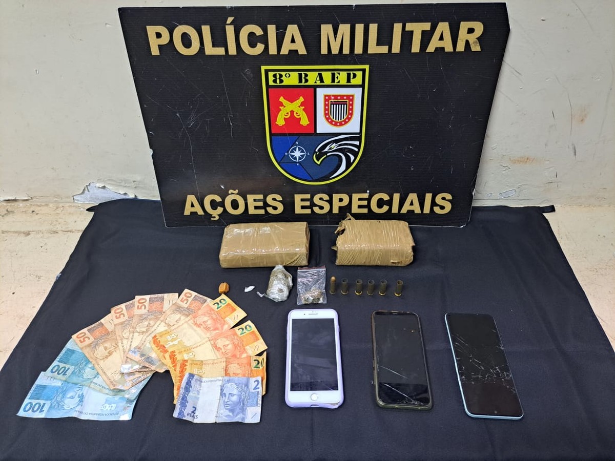 No local indicado, os agentes abordaram dois homens e encontraram na casa, embaixo de um colchão, uma sacola que continha dois tabletes de maconha, quatro porções de crack e cocaína, dois celulares, R$ 462,00 em dinheiro e cartões bancários.