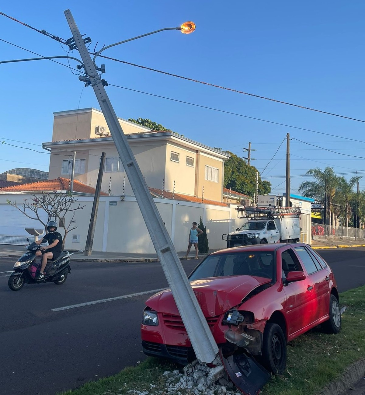 A concessionária Energia Sul-Sudeste, responsável pela distribuição de energia elétrica na cidade, foi acionada para realizar o reparo do poste.