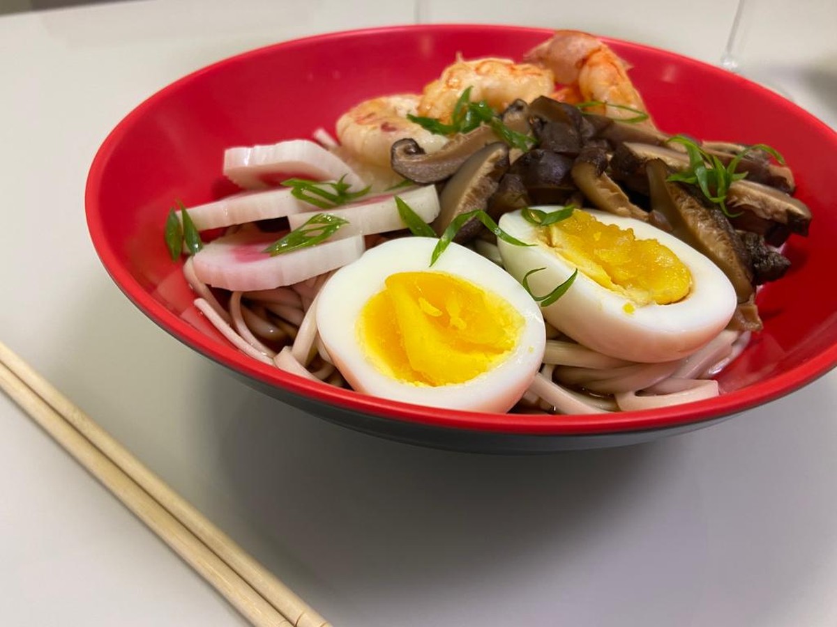 Por último, monte o prato adicionando ao macarrão os ovos cozidos, os camarões, os cogumelos cortados em tiras, o kamaboko cortado em rodelas, o caldo e, para finalizar, cebolinha picada.