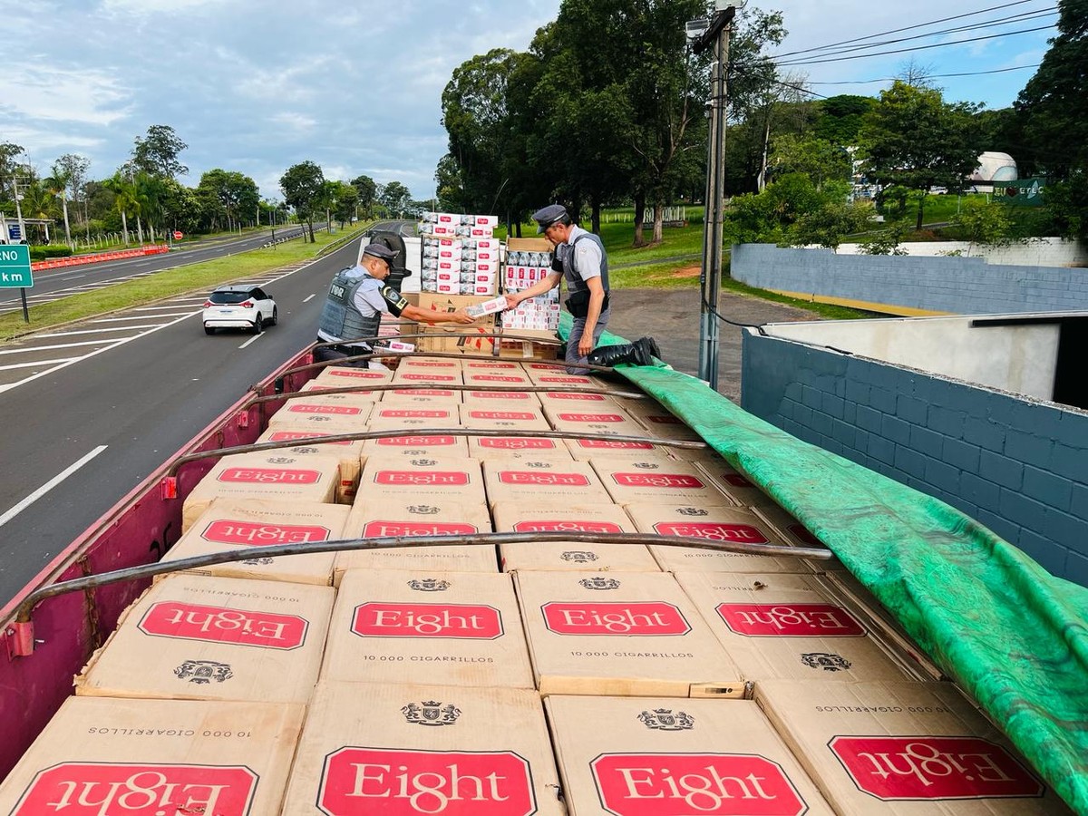 Dois homens, de 43 e 52 anos, foram presos em flagrante, nesta sexta-feira (29), com 475 mil maços de cigarros de origem estrangeira e sem documentação fiscal, no km 561,500 da Rodovia Raposo Tavares (SP-270), em Presidente Prudente (SP).