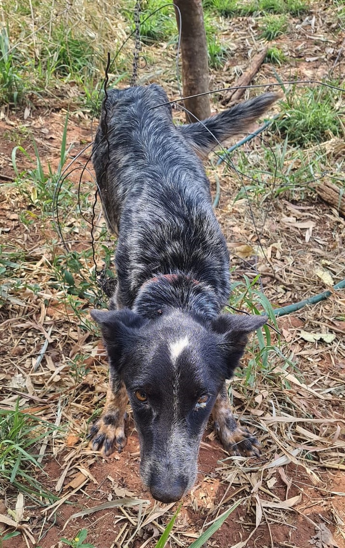 Além disso, a cachorra estava presa em uma corrente curta e enroscada em vários fios de arame, não conseguindo se locomover. Ela também estava sem alimentação e água disponíveis.